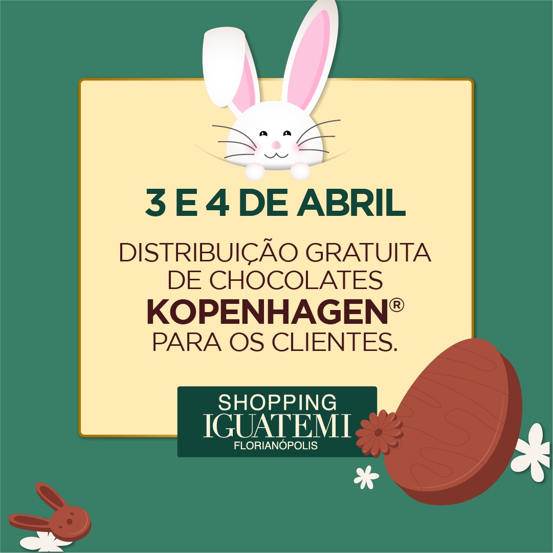 Nos 3 e 4 de abril (sábado e domingo), os clientes que estiverem pelo shopping fazendo suas compras de Páscoa, serão presenteados com um chocolate da Kopenhagen.