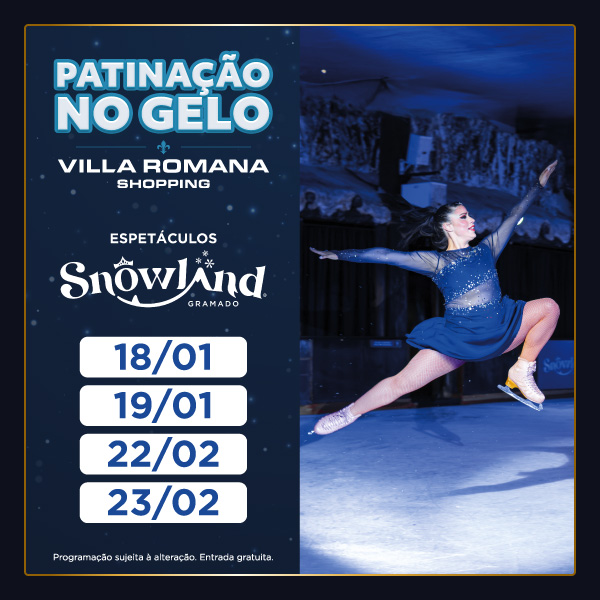 Se você gosta de patinação no gelo ou deseja se encantar com uma experiência única, janeiro e fevereiro são meses imperdíveis no Villa Romana Shopping. Patinadores artísticos do Parque de Neve Snowland se apresentarão a partir deste sábado (18), no shopping. O espetáculo, que é uma das maiores atrações do parque localizado em Gramado, no Rio Grande do Sul, é gratuito.