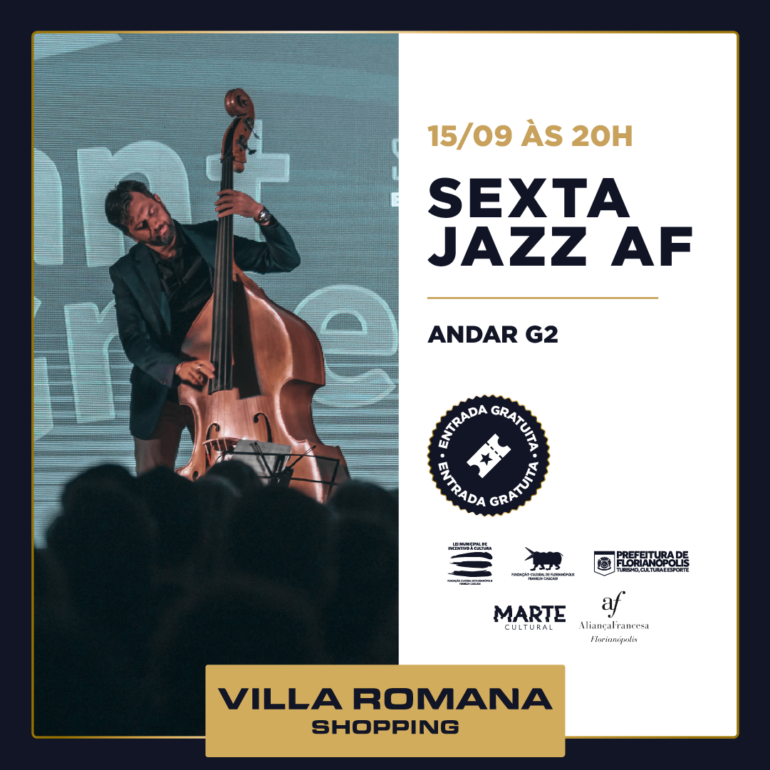 O Sexta Jazz AF de setembro de 2023 é viabilizado pela Prefeitura Municipal de Florianópolis, Secretaria de Turismo, Cultura e Esporte e Fundação Cultural de Florianópolis Franklin Cascaes por meio da Lei Municipal de Incentivo à Cultura de Florianópolis. Apoio cultural do Villa Romana Shopping. Produção da Marte Cultural. Realização da Aliança Francesa de Florianópolis.