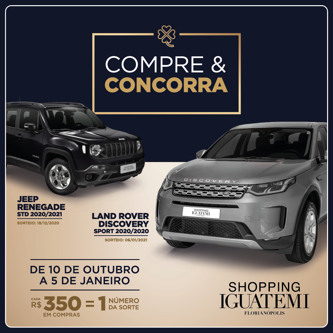 A tradicional campanha de fim de ano do empreendimento sorteará dois carros – uma Lange Rover Discovery Sport 2020/2020 e um Jeep Renegade STD 2020/2021.O sorteio do Jeep Renegade será no dia 19 de dezembro de 2020 e a Lange Rover será sorteada no dia 6 de janeiro de 2021, ambos pela loteria federal.