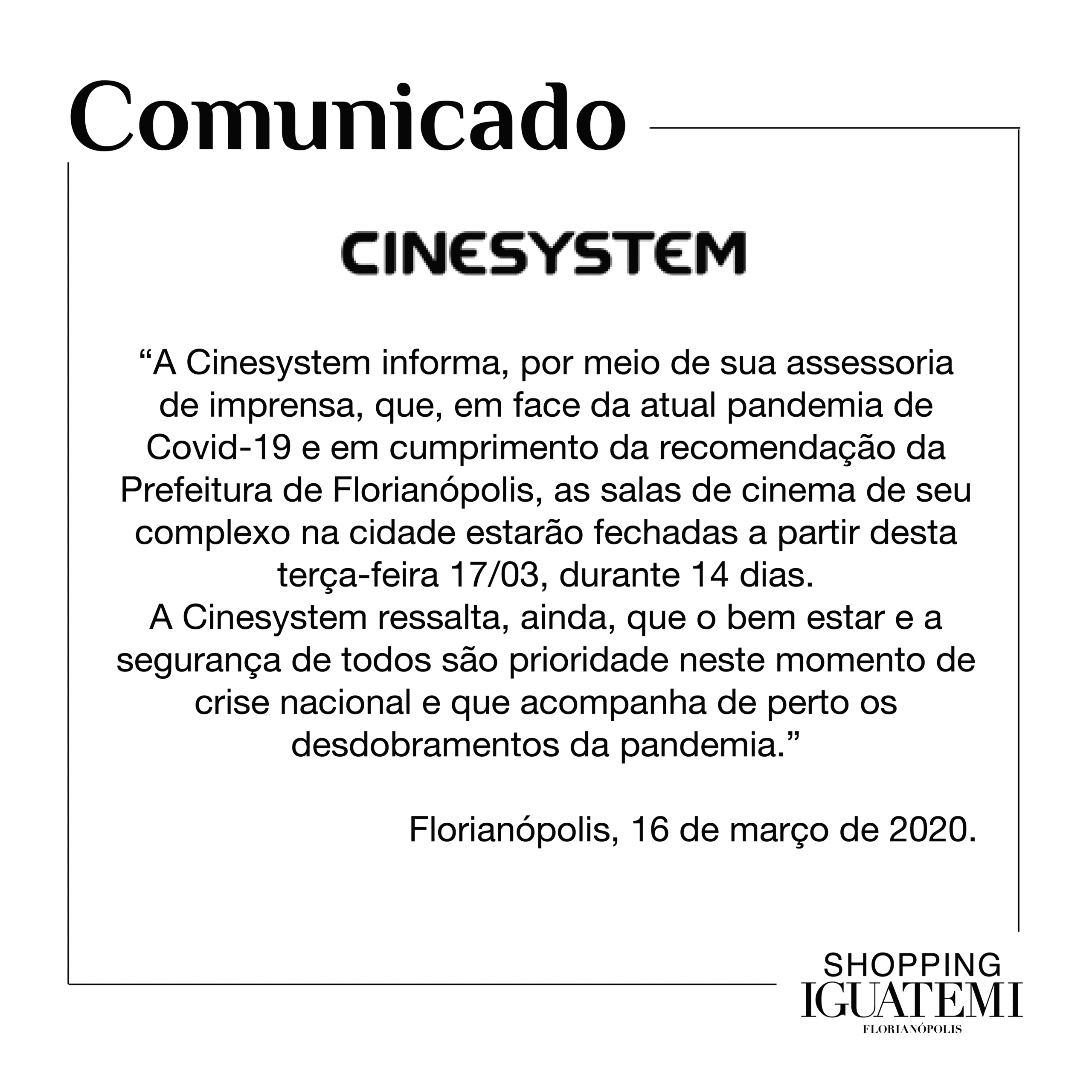 “A Cinesystem informa, por meio de sua assessoria de imprensa, que, em face da atual pandemia de Covid-19 e em cumprimento da recomendação da Prefeitura de Florianópolis, as salas de cinema de seu complexo na cidade estarão fechadas a partir desta terça-feira 17/03, durante 14 dias.