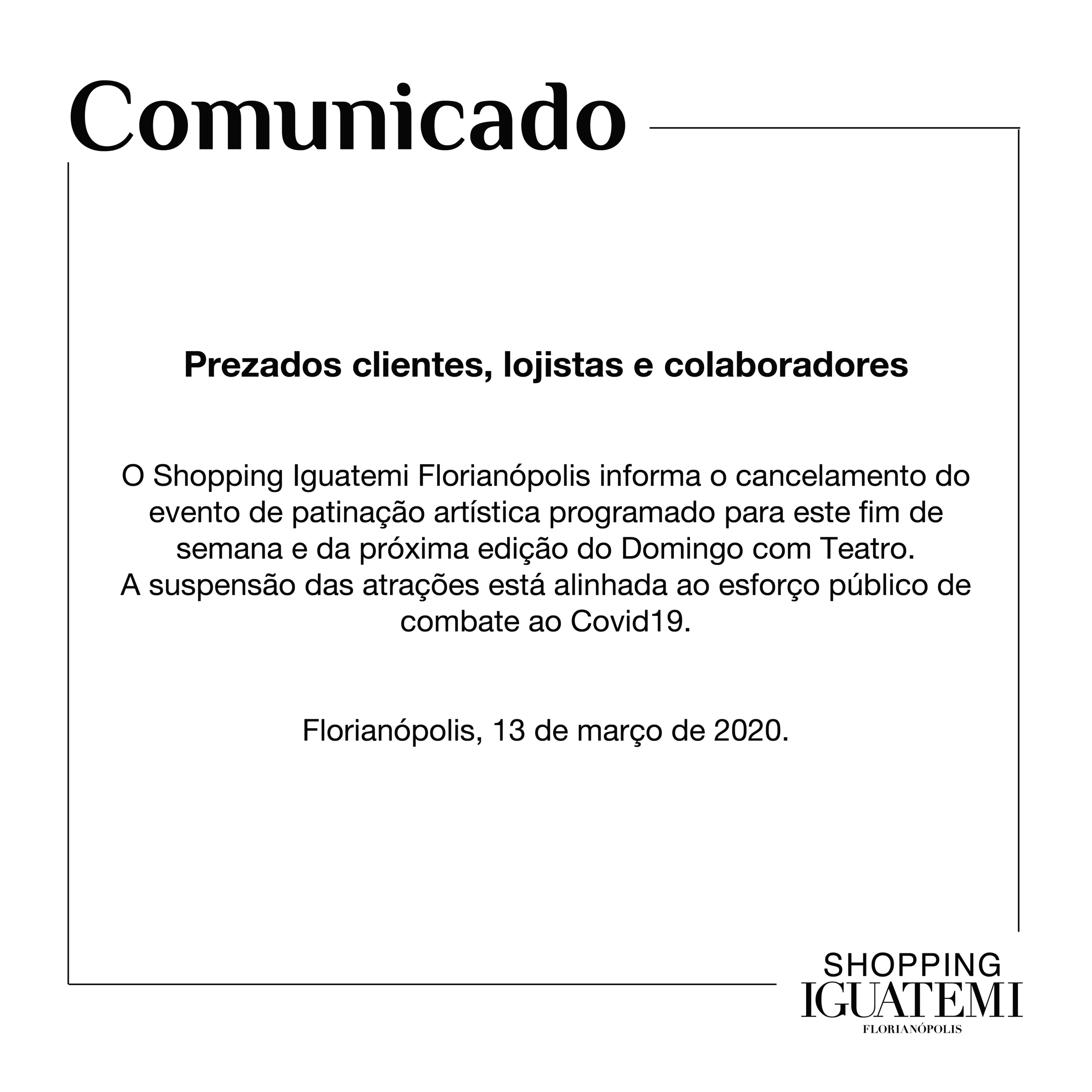 Prezados clientes, lojistas e colaboradores, o Shopping Iguatemi Florianópolis informa o cancelamento do evento de patinação artística programado para este fim de semana e da próxima edição do Domingo com Teatro.
