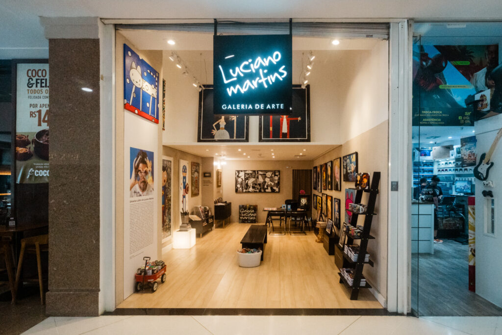 A Galeria Luciano Martins exibe e vende obras do artista, incluindo pinturas e gravuras que destacam sua arte vibrante e lúdica.