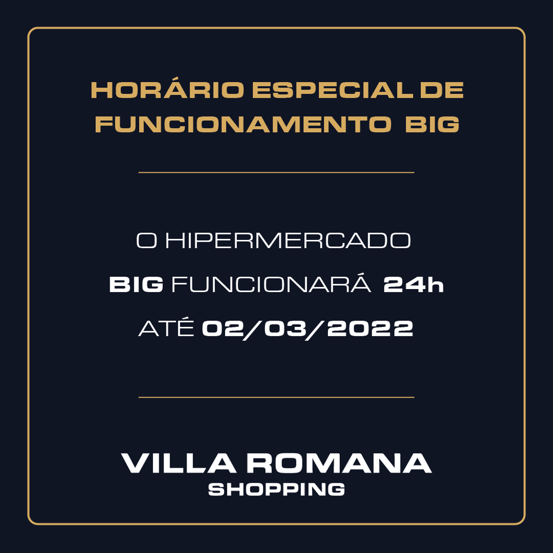 O Hipermercado BIG funcionará 24 horas* até 02/03/2022.