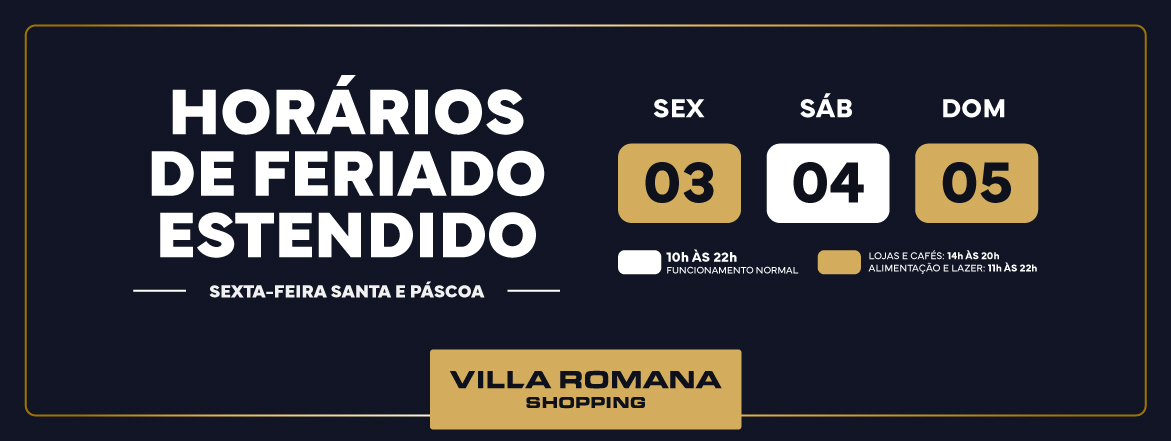 O Villa Romana Shopping, em Florianópolis, funcionará normalmente durante o feriado prolongado de Páscoa. Na Sexta-feira Santa (3) e no domingo (5), a praça de alimentação e as opções de lazer estarão abertas das 11h às 22h, enquanto as lojas e cafés atendem das 14h às 20h.
