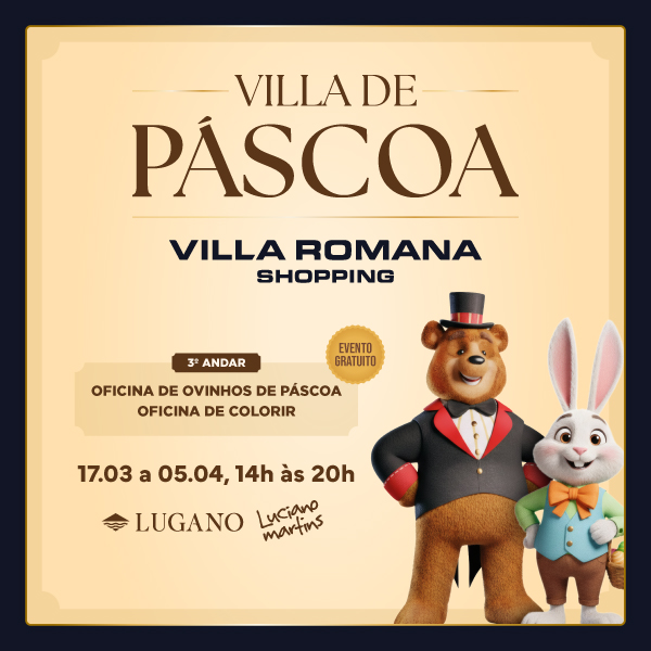 A agenda do período contempla a terceira edição da Villa de Páscoa, que segue até 5 de abril com atividades gratuitas voltadas ao público infantil. As atrações são realizadas diariamente, das 14h às 20h, no terceiro andar, em frente à loja Lugano, parceira da iniciativa. O espaço oferece oficinas de personalização de ovos de chocolate, atividades recreativas e sessões de pintura com ilustrações do artista plástico Luciano Martins. A ambientação temática e os brinquedos disponibilizados em parceria com a Ri Happy completam a experiência, que conta ainda com a presença do mascote Luguito nos finais de semana.