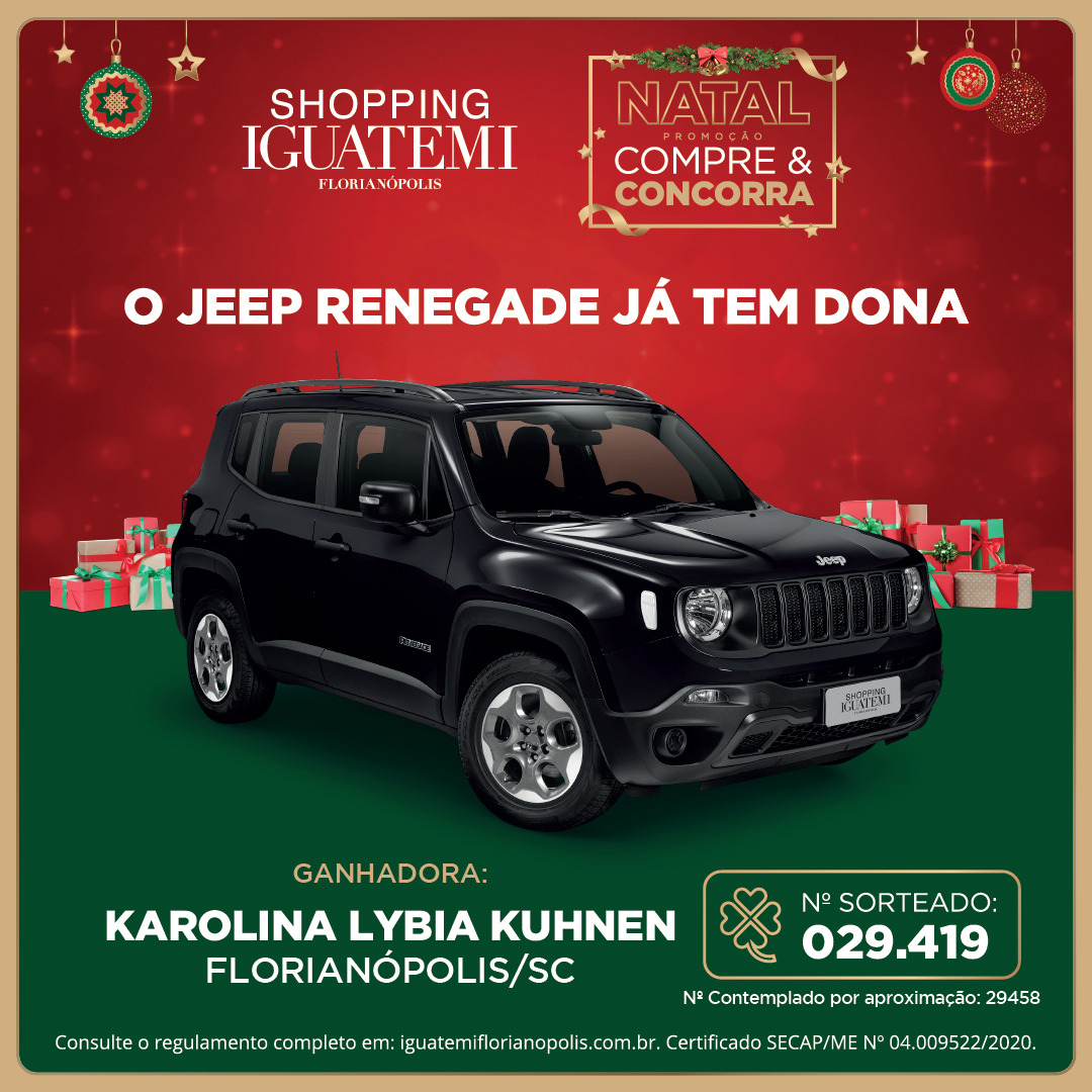 E a ganhadora do JEEP RENEGADE 2020/2021 do primeiro sorteio da promoção Compre e Concorra Shopping Iguatemi Florianópolis foi KAROLINA LYBIA KUHNEN, com o número da sorte 29.458, da cidade de Florianópolis/SC.
