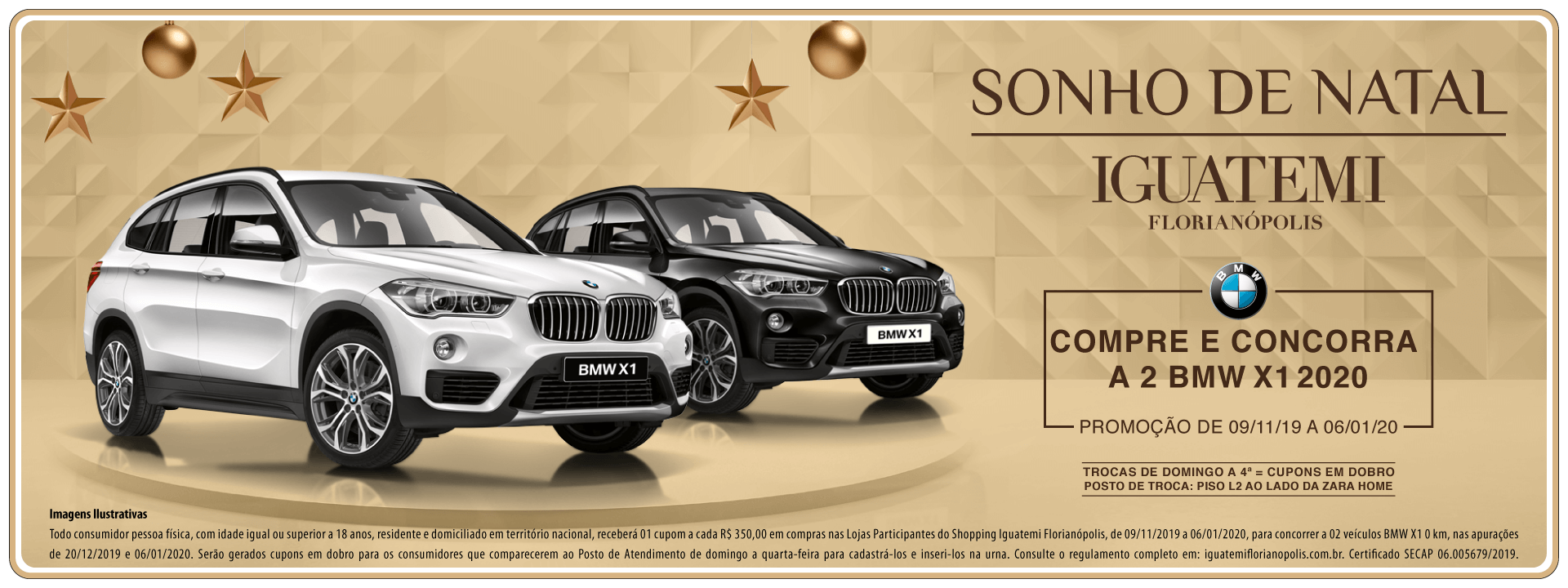 Já sonhou em ter uma BMW na sua garagem? Na promoção Sonho de Natal do Iguatemi Florianópolis você pode realizar seu sonho. A cada R$350,00 em compras nas lojas participantes você ganha 1 cupom para concorrer as 2 BMW X1 2020, as primeiras a chegarem em Santa Catarina! A promoção é válida de 09/11/2019 a 06/01/2020.
