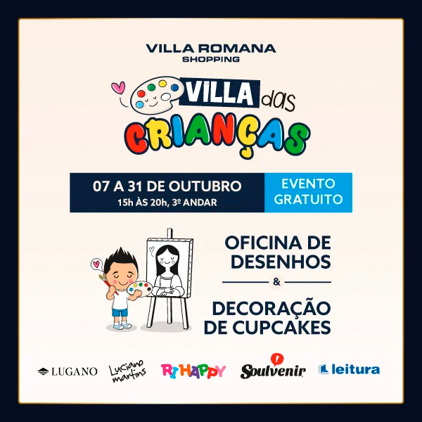 Até o dia 12 de outubro, sempre das 15h às 20h, as crianças poderão participar de oficinas de desenhos para colorir, com ilustrações exclusivas do artista plástico Luciano Martins, e de decoração de cupcakes em parceria com a Lugano. As atividades acontecem na Villa das Crianças, 3º andar, e não é necessário inscrição prévia para participar.